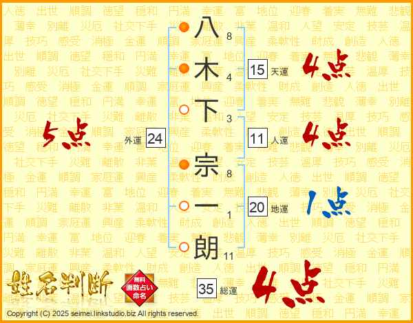 八(8画)木(4画)下(3画) 宗(8画)一(1画)朗(11画)