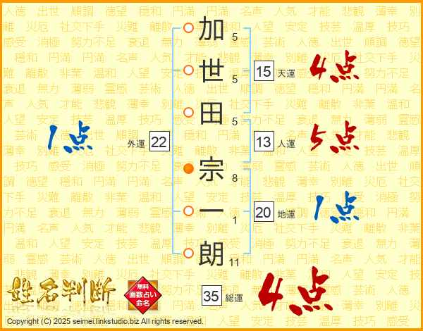 加(5画)世(5画)田(5画) 宗(8画)一(1画)朗(11画)