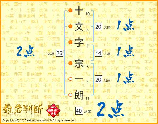生活面を象徴する運勢です。外部から受ける影響力を表し、結婚運、家庭運や職場、環境への順応性を表します。総運から人運を引いた画数。姓や名が1文字の場合を除く。