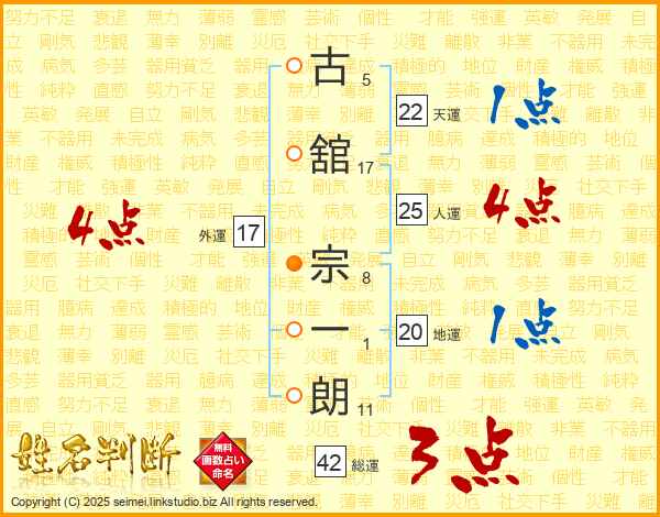 古(5画)舘(17画) 宗(8画)一(1画)朗(11画)
