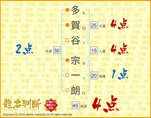 多(6画)賀(12画)谷(7画) 宗(8画)一(1画)朗(11画)