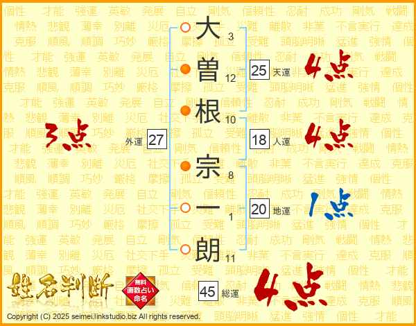 大(3画)曽(12画)根(10画) 宗(8画)一(1画)朗(11画)