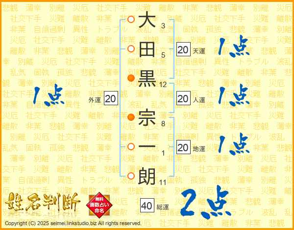 大(3画)田(5画)黒(12画) 宗(8画)一(1画)朗(11画)