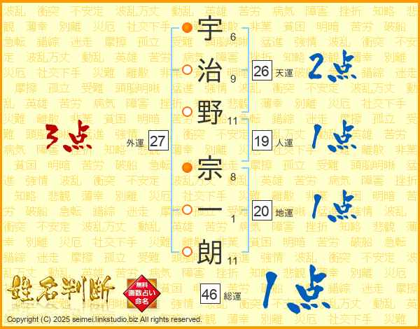 宇(6画)治(9画)野(11画) 宗(8画)一(1画)朗(11画)