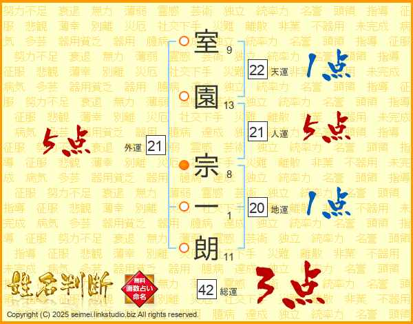 室(9画)園(13画) 宗(8画)一(1画)朗(11画)