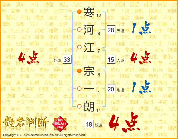 生活面を象徴する運勢です。外部から受ける影響力を表し、結婚運、家庭運や職場、環境への順応性を表します。総運から人運を引いた画数。姓や名が1文字の場合を除く。