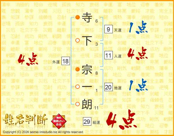 寺(6画)下(3画) 宗(8画)一(1画)朗(11画)