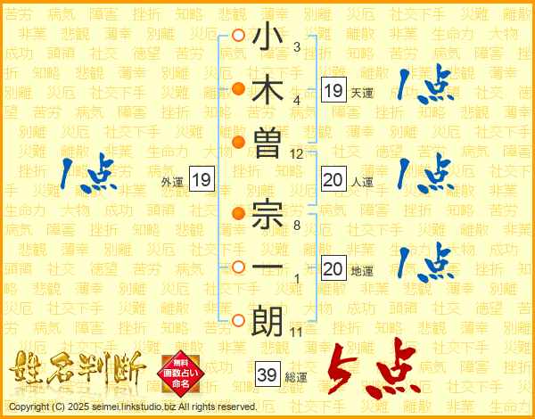 小(3画)木(4画)曽(12画) 宗(8画)一(1画)朗(11画)