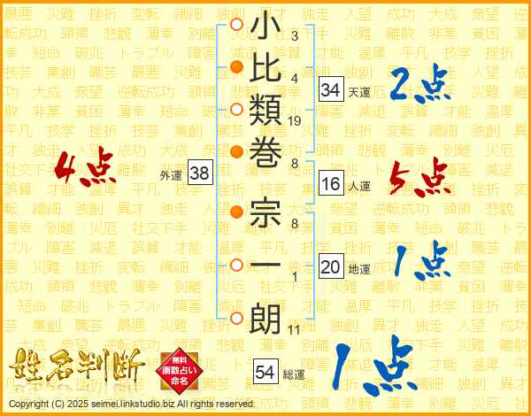 小(3画)比(4画)類(19画)巻(8画) 宗(8画)一(1画)朗(11画)
