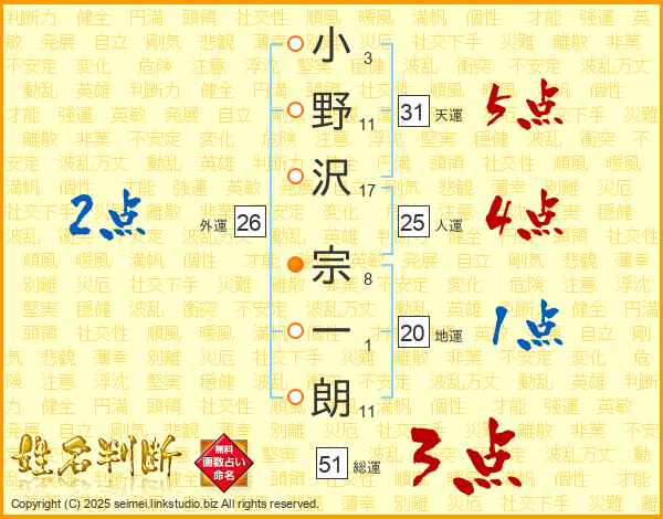 小(3画)野(11画)沢(17画) 宗(8画)一(1画)朗(11画)