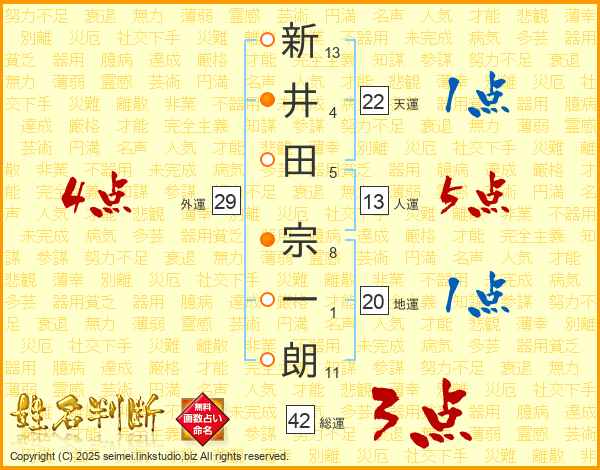 新(13画)井(4画)田(5画) 宗(8画)一(1画)朗(11画)