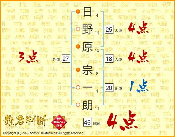 日(4画)野(11画)原(10画) 宗(8画)一(1画)朗(11画)