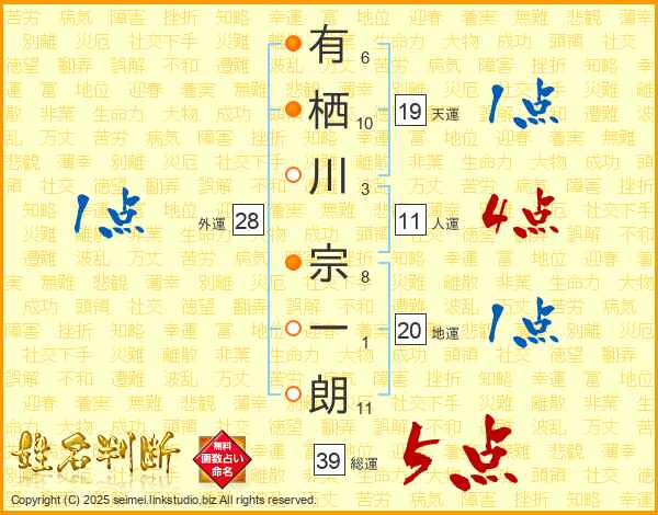 有(6画)栖(10画)川(3画) 宗(8画)一(1画)朗(11画)