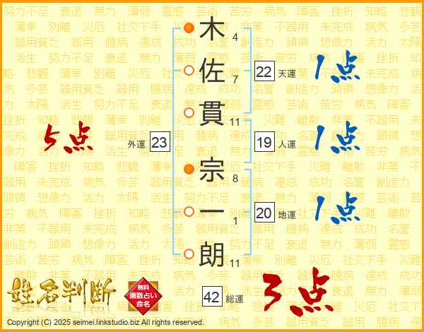 木(4画)佐(7画)貫(11画) 宗(8画)一(1画)朗(11画)