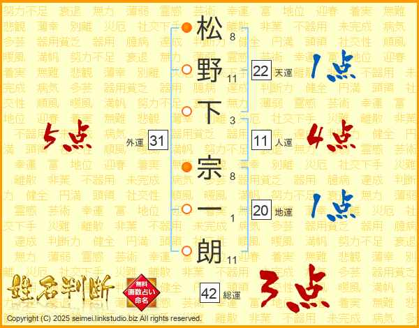 松(8画)野(11画)下(3画) 宗(8画)一(1画)朗(11画)