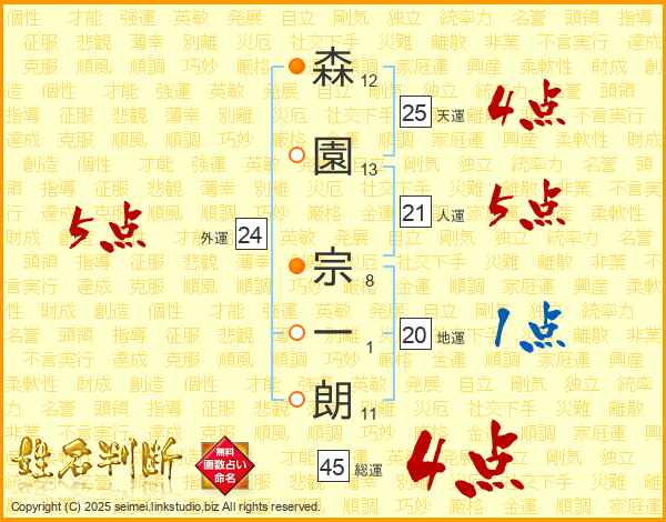 森(12画)園(13画) 宗(8画)一(1画)朗(11画)