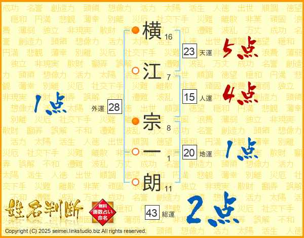 横(16画)江(7画) 宗(8画)一(1画)朗(11画)