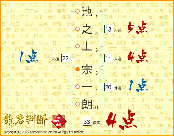 生活面を象徴する運勢です。外部から受ける影響力を表し、結婚運、家庭運や職場、環境への順応性を表します。総運から人運を引いた画数。姓や名が1文字の場合を除く。