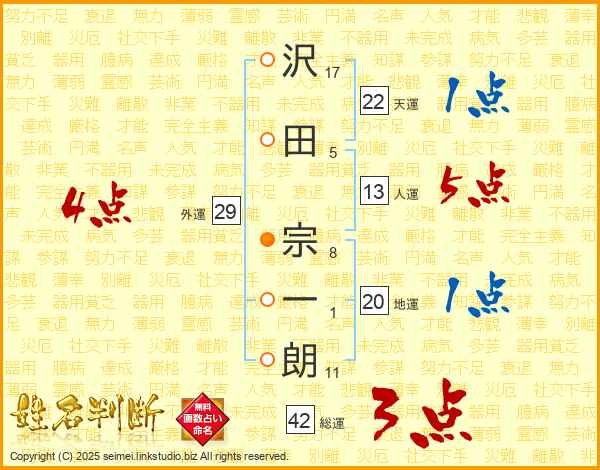 沢(17画)田(5画) 宗(8画)一(1画)朗(11画)