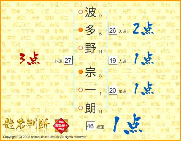 波(9画)多(6画)野(11画) 宗(8画)一(1画)朗(11画)