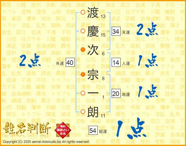 渡(13画)慶(15画)次(6画) 宗(8画)一(1画)朗(11画)