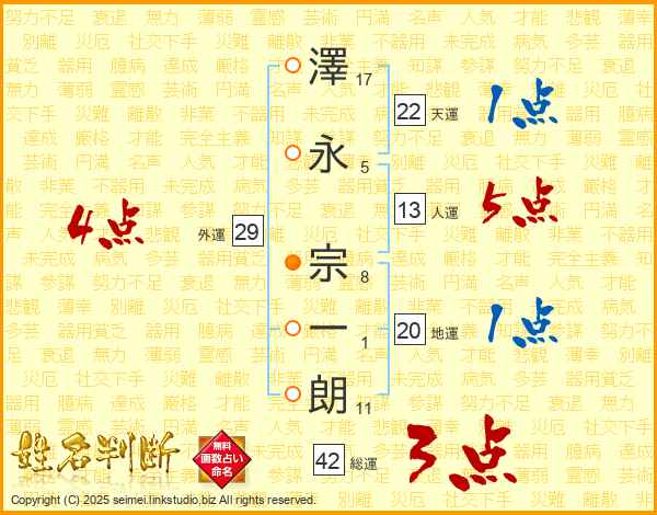 澤(17画)永(5画) 宗(8画)一(1画)朗(11画)