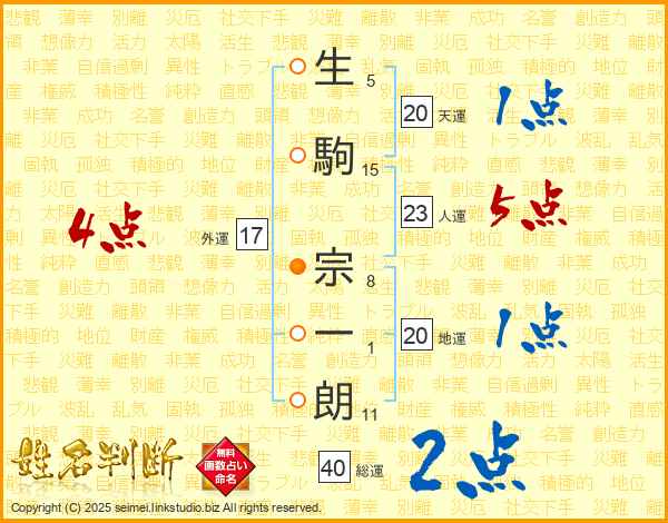 生(5画)駒(15画) 宗(8画)一(1画)朗(11画)