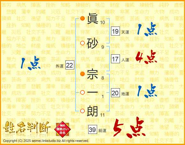 眞(10画)砂(9画) 宗(8画)一(1画)朗(11画)