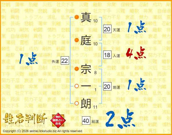 真(10画)庭(10画) 宗(8画)一(1画)朗(11画)