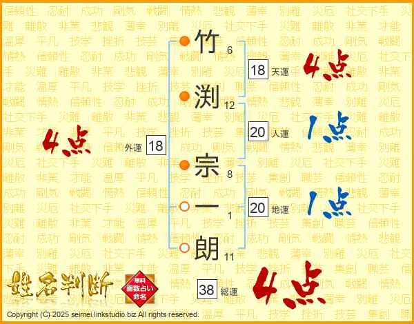 竹(6画)渕(12画) 宗(8画)一(1画)朗(11画)