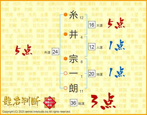 糸(12画)井(4画) 宗(8画)一(1画)朗(11画)