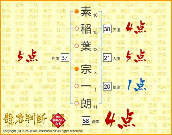 素(10画)稲(15画)葉(13画) 宗(8画)一(1画)朗(11画)