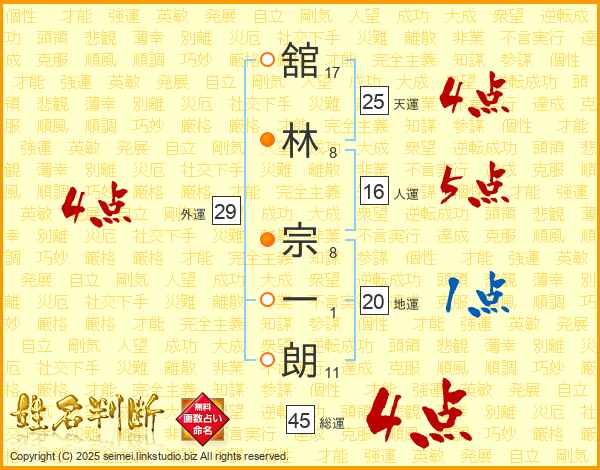 舘(17画)林(8画) 宗(8画)一(1画)朗(11画)
