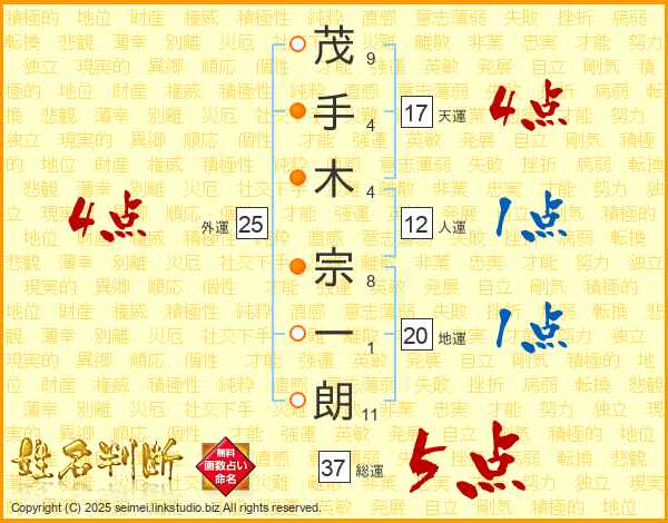 茂(9画)手(4画)木(4画) 宗(8画)一(1画)朗(11画)