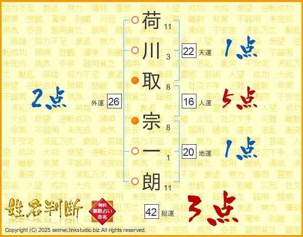 荷(11画)川(3画)取(8画) 宗(8画)一(1画)朗(11画)