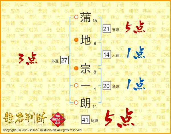 蒲(15画)地(6画) 宗(8画)一(1画)朗(11画)