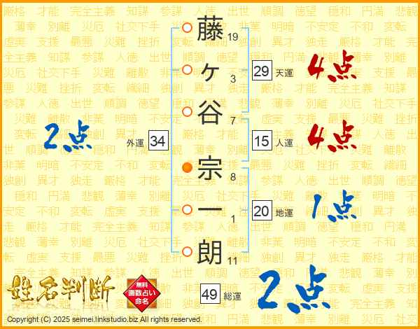 藤ヶ谷宗一朗さんの総運は49画の2点!