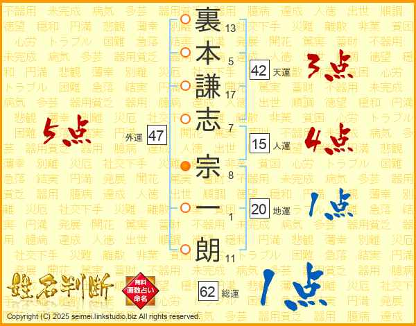 裏本謙志宗一朗さんの総運は62画の1点!