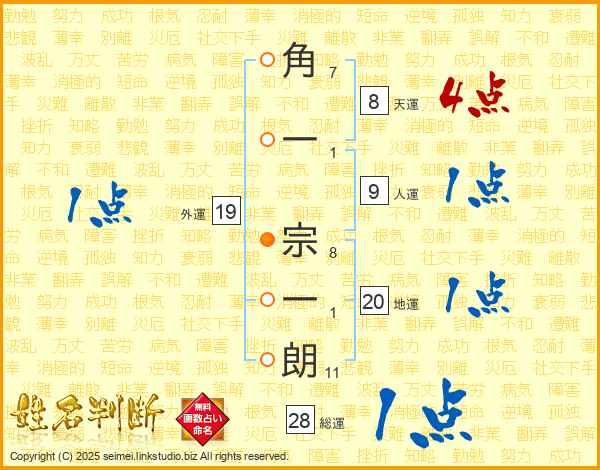 生活面を象徴する運勢です。外部から受ける影響力を表し、結婚運、家庭運や職場、環境への順応性を表します。総運から人運を引いた画数。姓や名が1文字の場合を除く。