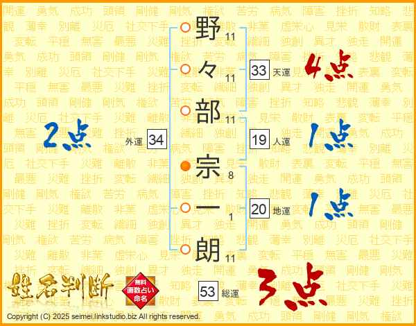 野(11画)々(11画)部(11画) 宗(8画)一(1画)朗(11画)
