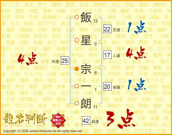 飯(13画)星(9画) 宗(8画)一(1画)朗(11画)