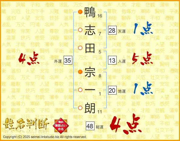 鴨(16画)志(7画)田(5画) 宗(8画)一(1画)朗(11画)