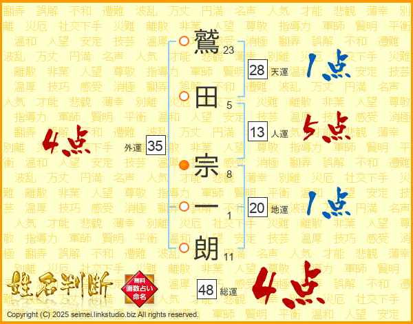 鷲(23画)田(5画) 宗(8画)一(1画)朗(11画)