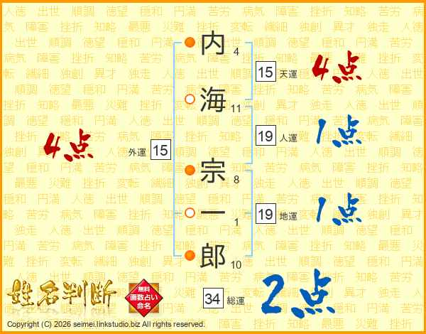 内(4画)海(11画) 宗(8画)一(1画)郎(10画)