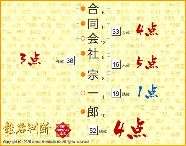 合(6画)同(6画)会(13画)社(8画) 宗(8画)一(1画)郎(10画)