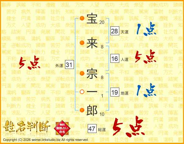 宝来宗一郎さんの総運は47画の5点!