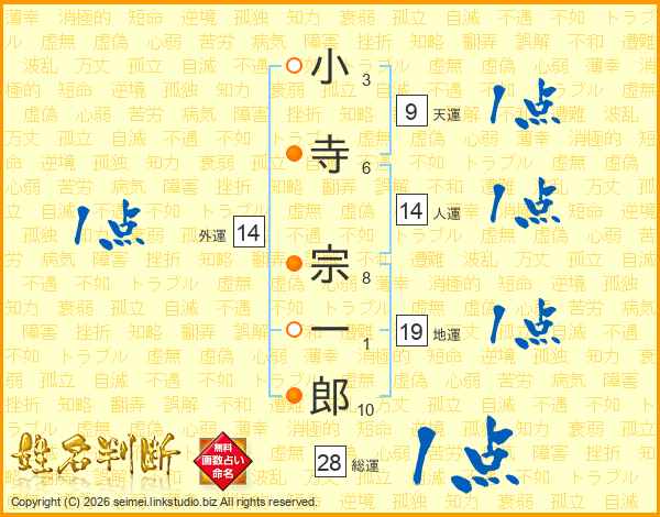 小(3画)寺(6画) 宗(8画)一(1画)郎(10画)