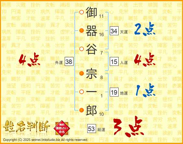 御(11画)器(16画)谷(7画) 宗(8画)一(1画)郎(10画)