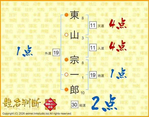 東(8画)山(3画) 宗(8画)一(1画)郎(10画)