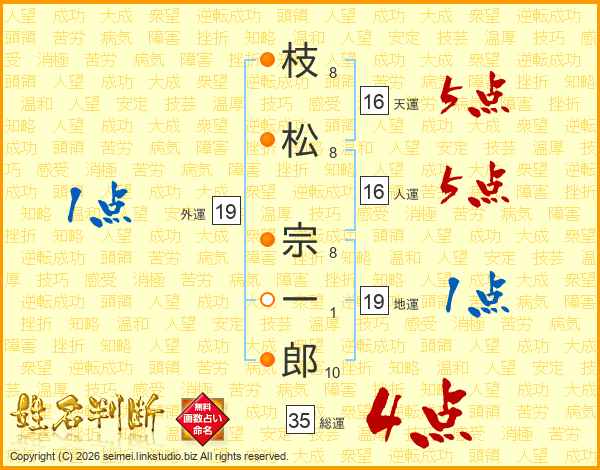 枝(8画)松(8画) 宗(8画)一(1画)郎(10画)